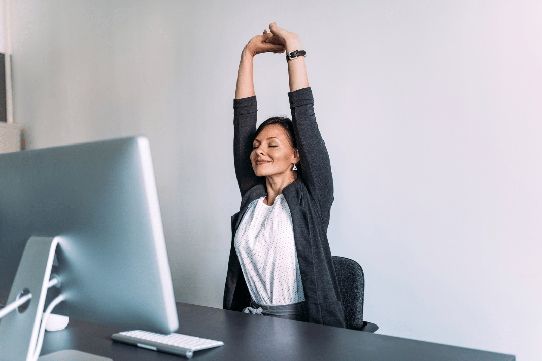 Hold a gentle, sustained stretch for your wrists and fingers. This can relieve the tension built up from typing all day and serves as a physical cue to release stress.